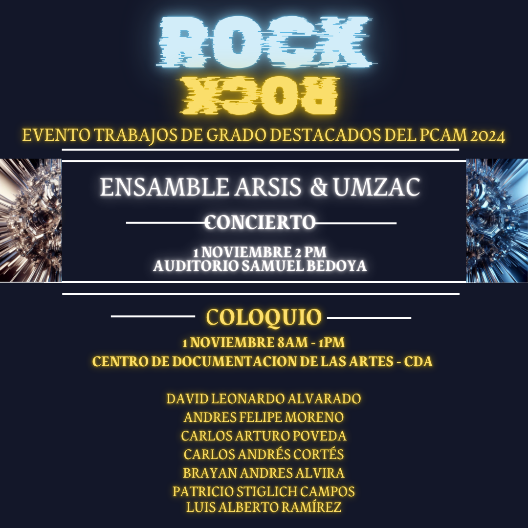 (*) El Evento "Trabajos de Grado Destacados 2024" del PCAM, organizado por el Grupo de Trabajos de Grado del PCAM, se llevará a cabo en el Centro de Documentación de las Artes (CDA) y en el Auditorio Samuel Bedoya de la Facultar de Artes ASAB